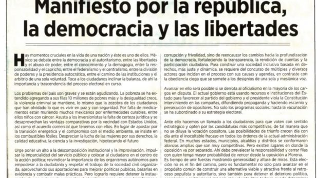 Académicos, intelectuales, periodistas e historiadores firmaron un “Manifiesto por la República, a la democracia y a las libertades”, en donde expresan su rechazo al autoritarismo, abuso de poder, capricho, en el que señalan se encuentran sumido actualmente el país.