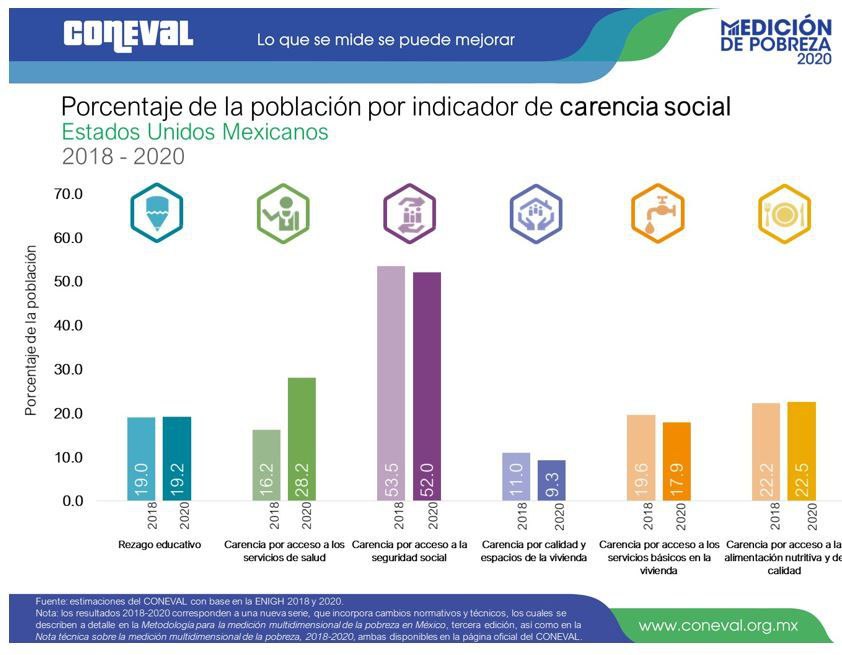 De acuerdo al último estudio del organismo dedicado a medir la pobreza, en tan sólo dos años, esta cifra se elevó a 3.8 millones de personas que ya no cuentan con los recursos suficientes para subsistir y qué decir de la población en situación de pobreza extrema que registró un aumento de 2.1 millones al cierre del 2020, es decir, que 8.7 a 10.8 millones de personas que no tienen ni para adquirir una canasta básica.